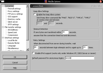 In the Connection tab, uncheck the Enable the Keep Alive system box and change the Retry Settings to a value which will not hammer a server. Hammering a server refers to having too small a delay between connection retrys to a busy (i.e. full) server. If you're trying to connect to an FTP server from an IRC channel (see IRC guide) and your retry delay is too low, you will be banned from that server. Also, change the try again up to value to something nice. I set mine to 15. That means if a server is busy (full) it'll try to connect 15 times with a 65 second delay between attempts. If you put it to something like 999, that should be enough to transfer a queue (explained below) while you sleep. In the Timeout Detection box, set the time to something like 30 seconds or less. This will automatically disconnect you from the server after your queue is transferred. Most FTP server operators don't want you idling (doing nothing) on their servers. You have 30 seconds to cancel the automatic disconnect if you decide there's something else you need to do. Disconnecting when your queue is sent is just common courtesy. One more setting to change is in the File transfer settings section. Uncheck the Use multiple connections to transfer files box as it could get you banned.