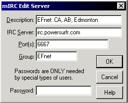 Connecting to a server Go to the Connect section under File --> Options and you'll see a section labeled IRC Servers. There are groups of servers which sync to each other to form networks. Examples of major IRC networks are Dalnet, EFnet and Undernet. There are also standalone servers which are not part of a larger network. I'll use EFnet as an example for this guide. Click the Add button beside the displayed server. Put whatever description you want (ex. EFnet: CA, AB, Edmonton). For IRC Server use irc.powersurfr.com. Put a value of 6667 in Port(s) and in the Group field type EFnet. Click OK to add this server to your list. I use irc.powersurfr.com as an example because it is one of the few that does not require