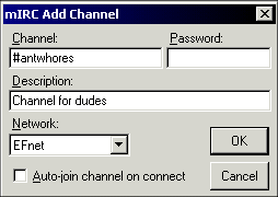 FTP guide which outlines FTP etiquette and explains hammering. Another typical rule is to stay in the channel while you are downloading from a server listed in the channel. The FServe and FTP site messages are on Timers which automatically repeat after a specified number of seconds. You can also set up your own Timers to request crap or display something. I find request timers to be very annoying so figure out how to use 'em on your own. You can also, of course, chat with other people in the channel. I don't chat unless it's someone I already know mostly because I'm there to get what I'm looking for and be out. In the channels I frequent there are usually hundreds of users and about a dozen who actually chat. If you like the channel and think you'll be connecting to it frequently you can add it to your "favorites" list which is accessed by clicking the Channels folder icon on the toolbar . Click the Add button and enter the appropriate information making sure you put a # before the channel name.