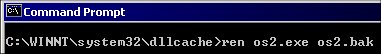 the WINNT\SYSTEM32\DLLCACHE directory. Type ren os2.exe os2.bak